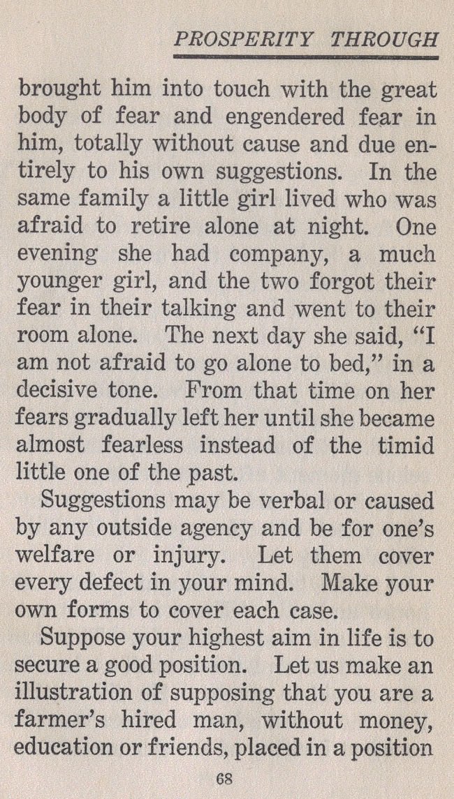 brought him into touch with the great body of fear and engendered fear in him, totally without cause and due entirely to his own suggestions. In the same family a little girl lived who was afraid to retire alone at night. One evening she had company, a much younger girl, and the two forgot their fear in their talking and went to their room alone. The next day she said, "I am not afraid to go alone to bed," in a decisive tone. From that time on her fears gradually left her until she became almost fearless instead of the timid little one of the past.