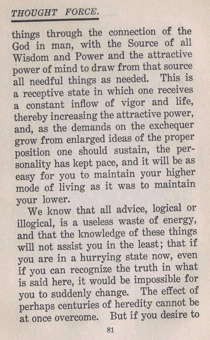 We know that all advice, logical or illogical, is a useless waste of energy, and that the knowledge of these things will not assist you in the least; that if you are in a hurrying state now, even if you can recognize the truth in what is said here, it would be impossible for you to suddenly change. The effect of perhaps centuries of heredity cannot be at once overcome. But if you desire to