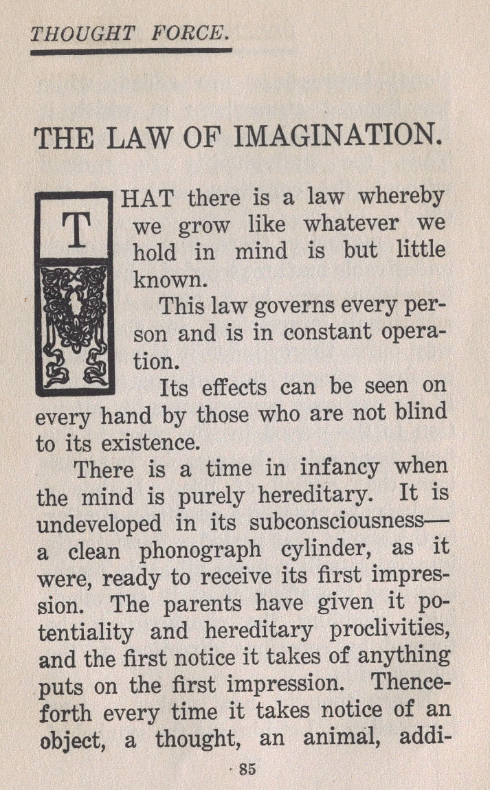 There is a time in infancy when the mind is purely hereditary. It is undeveloped in its subconsciousness --- a clean phonograph cylinder, as it were, ready to receive its first impression. The parents have given it potentiality and hereditary proclivities, and the first notice it takes of anything puts on the first impression. Thenceforth every time it takes notice of an object, a thought, an animal, additional