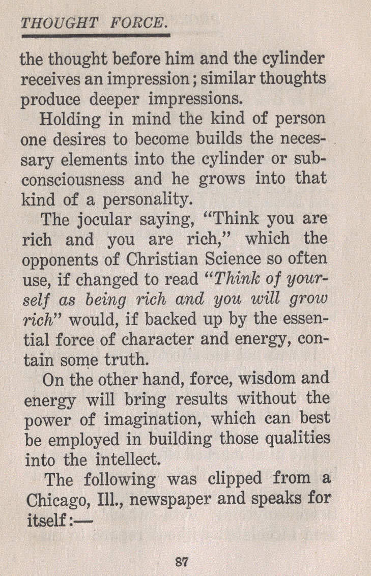 The jocular saying, "Think you are rich and you are rich," which the opponents of Christian Science so often use, if changed to read "Think of yourself as being rich and you will grow rich" would, if backed up by the essential force of character and energy, contain some truth.