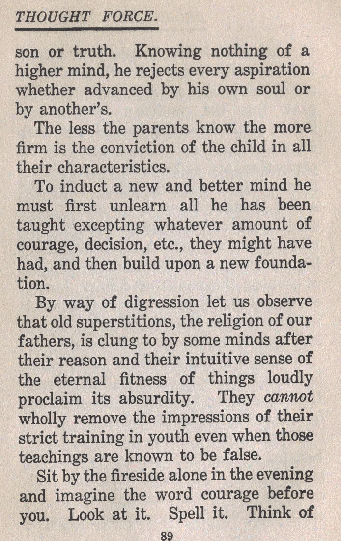 By way of digression let us observe that old superstitions, the religion of our fathers, is clung to by some minds after their reason and their intuitive sense of the eternal fitness of things loudly proclaim its absurdity. They cannot wholly remove the impressions of their strict training in youth even when those teachings are known to be false.