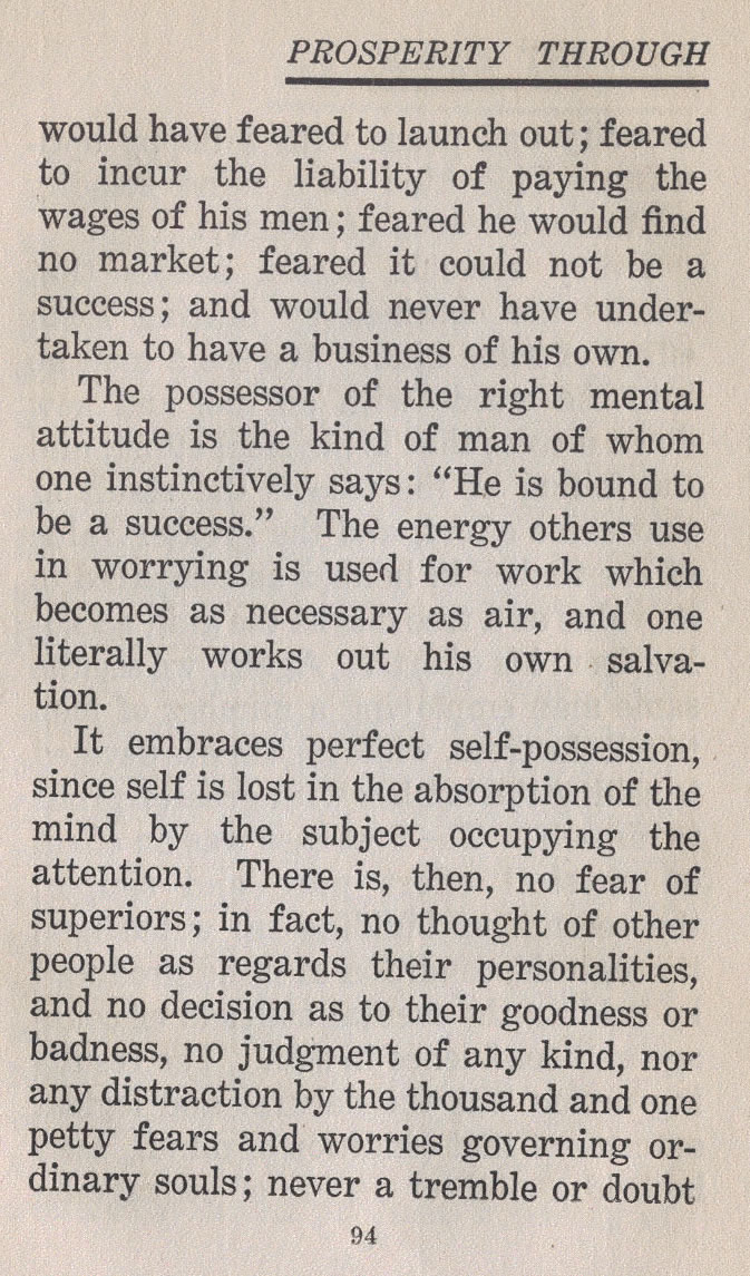 The possessor of the right mental attitude is the kind of man of whom one instinctively says: "He is bound to be a success." The energy others use in worrying is used for work which becomes as necessary as air, and one literally works out his own salvation.