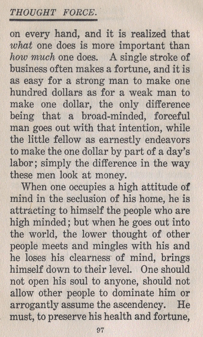 When one occupies a high attitude of mind in the seclusion of his home, he is attracting to himself the people who are high minded; but when he goes out into the world, the lower thought of other people meets and mingles with his and he loses his clearness of mind, brings himself down to their level. One should not open his soul to anyone, should not allow other people to dominate him or arrogantly assume the ascendency. He must, to preserve his health and fortune,