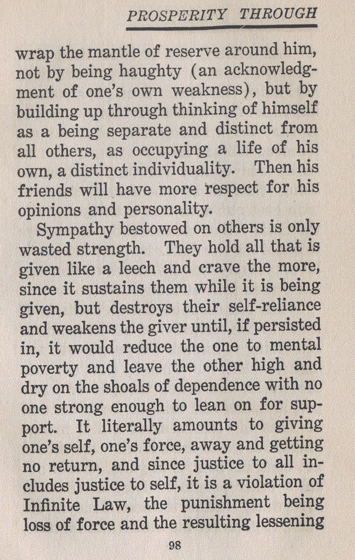 Sympathy bestowed on others is only wasted strength. They hold all that is given like a leech and crave the more, since it sustains them while it is being given, but destroys their self-reliance and weakens the giver until, if persisted in, it would reduce the one to mental poverty and leave the other high and dry on the shoals of dependence with no one strong enough to lean on for support. It literally amounts to giving one's self, one's force, away and getting no return, and since justice to all includes justice to self, it is a violation of Infinite Law, the punishment being loss of force and the resulting lessening