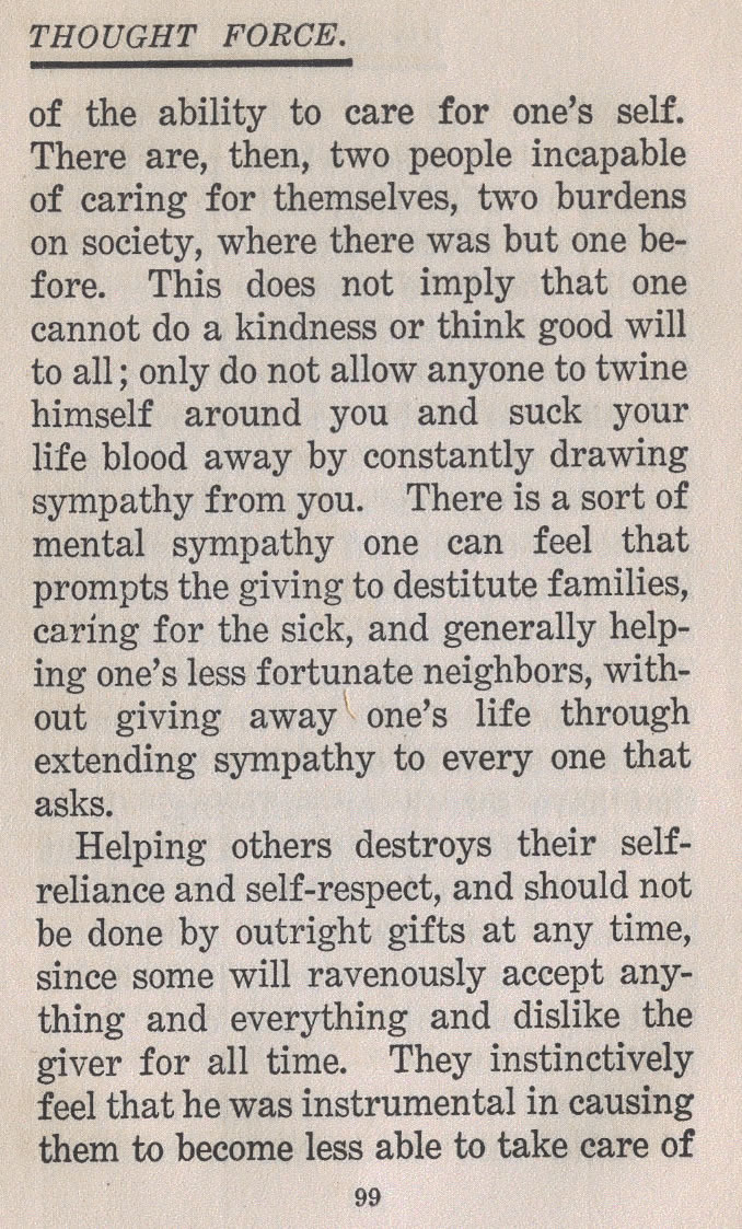 of the ability to care for one's self. There are, then, two people incapable of caring for themselves, two burdens on society, where there was but one before. This does not imply that one cannot do a kindness or think good will to all; only do not allow anyone to twine himself around you and suck your life blood away by constantly drawing sympathy from you. There is a sort of mental sympathy one can feel that prompts the giving to destitute families, caring for the sick, and generally helping one's less fortunate neighbors, without giving away one's life through extending sympathy to every one that asks.