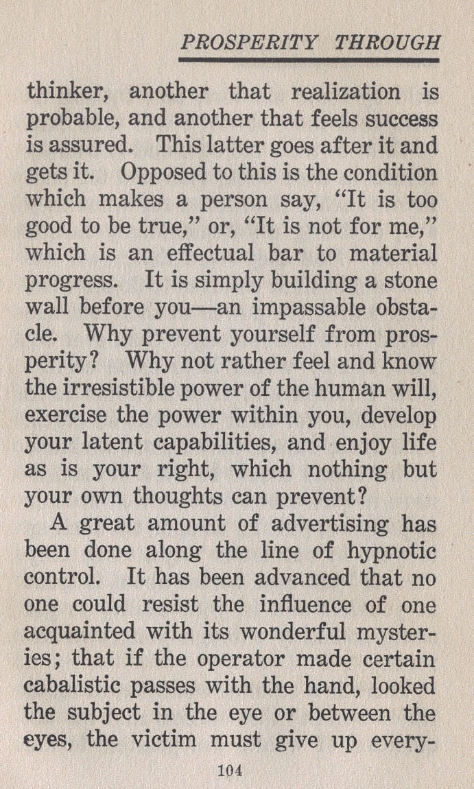 thinker, another that realization is probable, and another that feels success is assured. This latter goes after it and gets it. Opposed to this is the condition which makes a person say, "It is too good to be true," or, "It is not for me," which is an effectual bar to material progress. It is simply building a stone wall before you --- an impassable obstacle. Why prevent yourself from prosperity? Why not rather feel and know the irresistible power of the human will, exercise the power within you, develop your latent capabilities, and enjoy life as is your right, which nothing but your own thoughts can prevent?