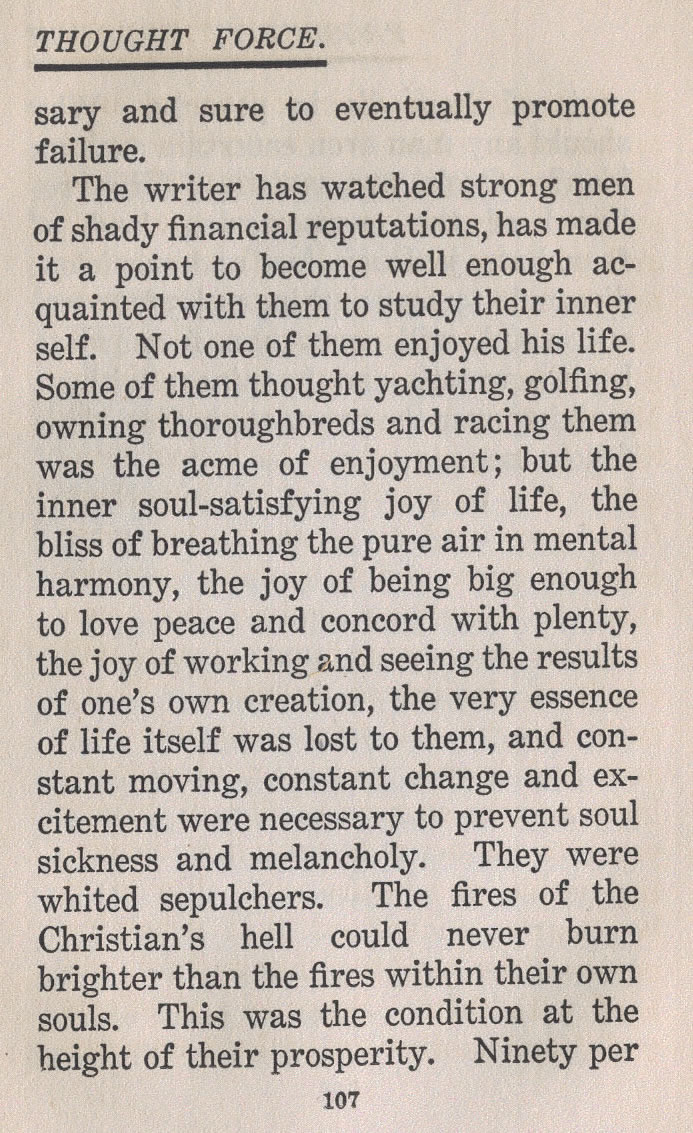The writer has watched strong men of shady financial reputations, has made it a point to become well enough acquainted with them to study their inner self. Not one of them enjoyed his life. Some of them thought yachting, golfing, owning thoroughbreds and racing them was the acme of enjoyment; but the inner soul-satisfying joy of life, the bliss of breathing the pure air in mental harmony, the joy of being big enough to love peace and concord with plenty, the joy of working and seeing the results of one's own creation, the very essence of life itself was lost to them, and constant moving, constant change and excitement were necessary to prevent soul sickness and melancholy. They were whited sepulchers. The fires of the Christian's hell could never burn brighter than the fires within their own souls. This was the condition at the height of their prosperity. Ninety percent.