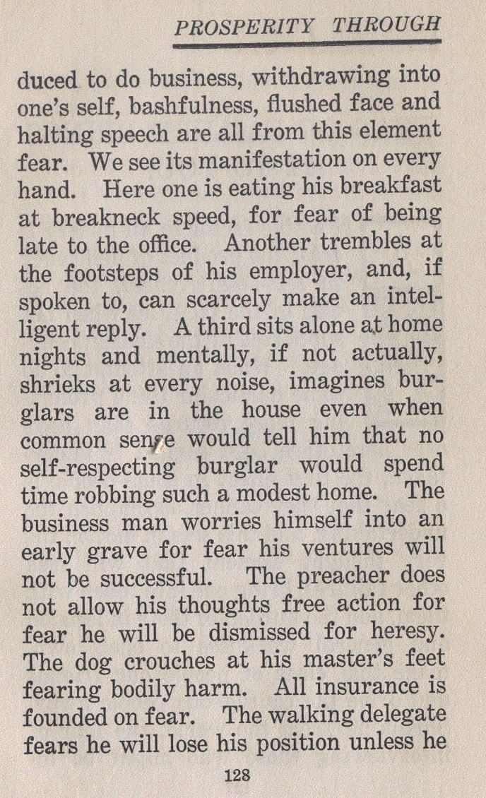 to do business, withdrawing into one's self, bashfulness, flushed face and halting speech are all from this element fear. We see its manifestation on every hand. Here one is eating his breakfast at breakneck speed, for fear of being late to the office. Another trembles at the footsteps of his employer, and, if spoken to, can scarcely make an intelligent reply. A third sits alone at home nights and mentally, if not actually, shrieks at every noise, imagines burglars are in the house even when common sense would tell him that no self-respecting burglar would spend time robbing such a modest home. The business man worries himself into an early grave for fear his ventures will not be successful. The preacher does not allow his thoughts free action for fear he will be dismissed for heresy. The dog crouches at his master's feet fearing bodily harm. All insurance is founded on fear. The walking delegate fears he will lose his position unless he