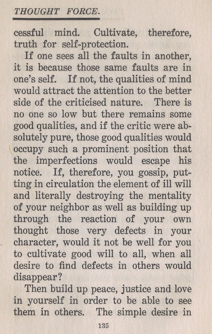 If one sees all the faults in another, it is because those same faults are in one's self. If not, the qualities of mind would attract the attention to the better side of the criticised nature. There is no one so low but there remains some good qualities, and if the critic were absolutely pure, those good qualities would occupy such a prominent position that the imperfections would escape his notice. If, therefore, you gossip, putting in circulation the element of ill will and literally destroying the mentality of your neighbor as well as building up through the reaction of your own thought those very defects in your character, would it not be well for you to cultivate good will to all, when all desire to find defects in others would disappear?