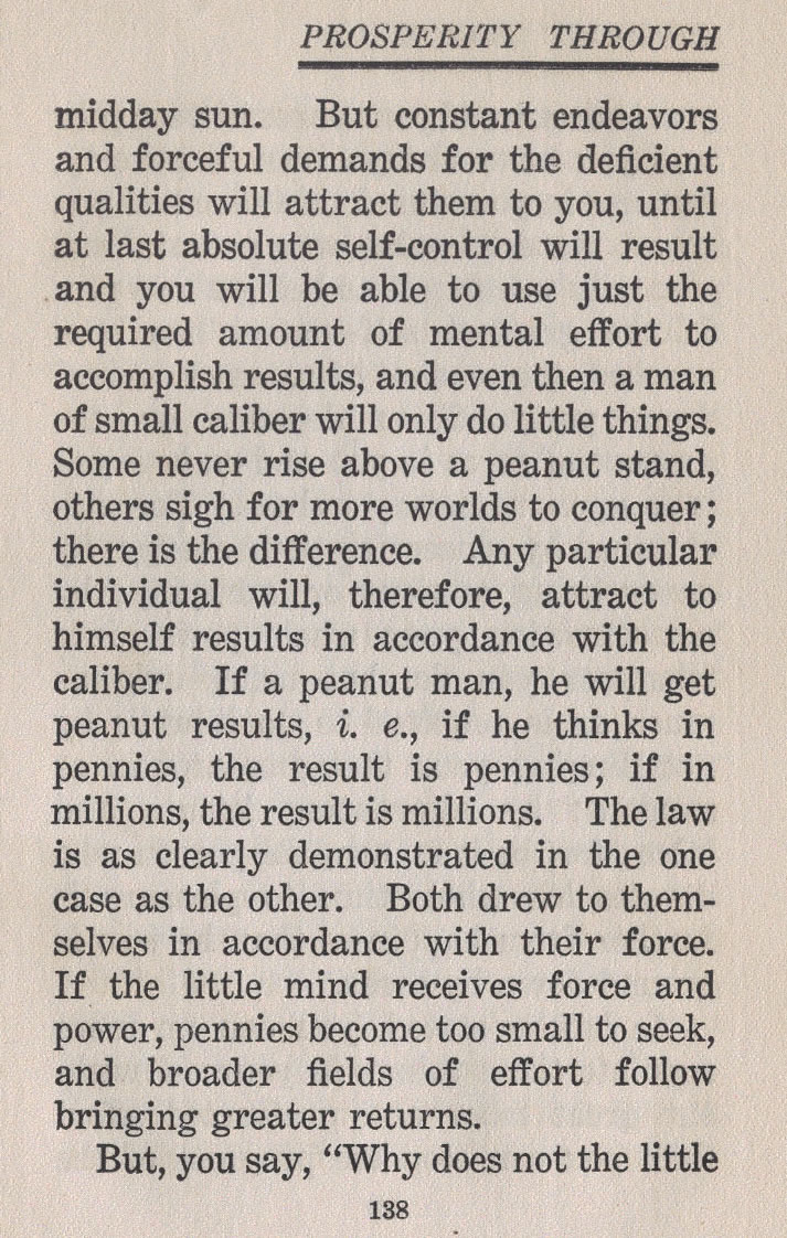 midday sun. But constant endeavors and forceful demands for the deficient qualities will attract them to you, until at last absolute self-control will result and you will be able to use just the required amount of mental effort to accomplish results, and even then a man of small caliber will only do little things. Some never rise above a peanut stand, others sigh for more worlds to conquer; there is the difference. Any particular individual will, therefore, attract to himself results in accordance with the caliber. If a peanut man, he will get peanut results, i. e., if he thinks in pennies, the result is pennies; if in millions, the result is millions. The law is as clearly demonstrated in the one case as the other. Both drew to themselves in accordance with their force. If the little mind receives force and power, pennies become too small to seek, and broader fields of effort follow bringing greater returns.