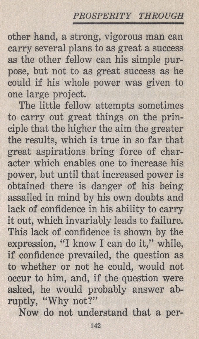The little fellow attempts sometimes to carry out great things on the principle that the higher the aim the greater the results, which is true in so far that great aspirations bring force of character which enables one to increase his power, but until that increased power is obtained there is danger of his being assailed in mind by his own doubts and lack of confidence in his ability to carry it out, which invariably leads to failure. This lack of confidence is shown by the expression, "I know I can do it," while, if confidence prevailed, the question as to whether or not he could, would not occur to him, and, if the question were asked, he would probably answer abruptly, "Why not?"