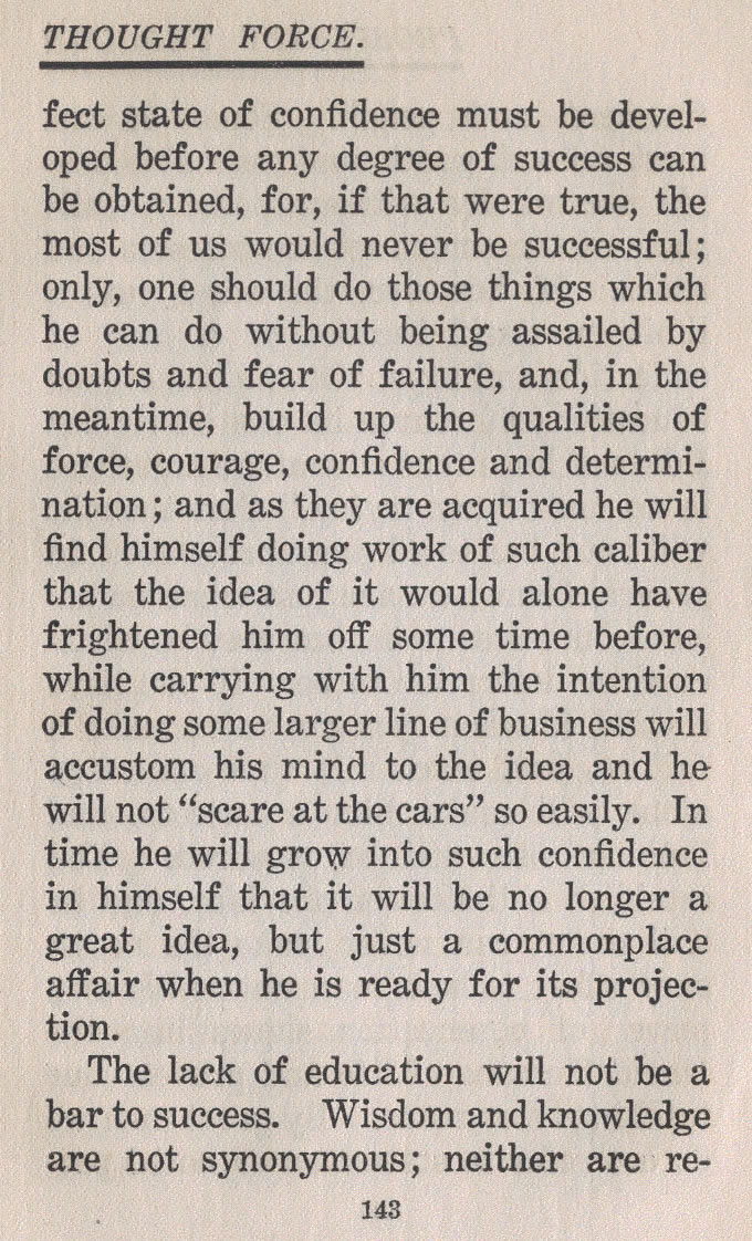 state of confidence must be developed before any degree of success can be obtained, for, if that were true, the most of us would never be successful; only, one should do those things which he can do without being assailed by doubts and fear of failure, and, in the meantime, build up the qualities of force, courage, confidence and determination; and as they are acquired he will find himself doing work of such caliber that the idea of it would alone have frightened him off some time before, while carrying with him the intention of doing some larger line of business will accustom his mind to the idea and he will not "scare at the cars" so easily. In time he will grow into such confidence in himself that it will be no longer a great idea, but just a commonplace affair when he is ready for its projection.