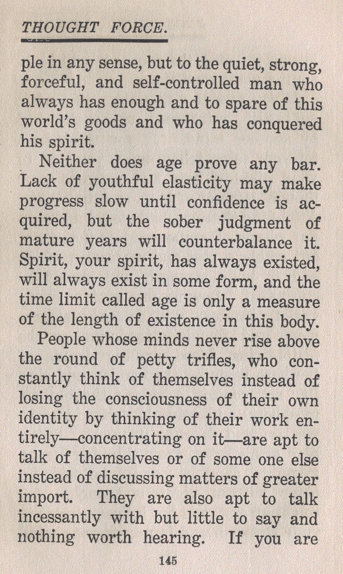 Neither does age prove any bar. Lack of youthful elasticity may make progress slow until confidence is acquired, but the sober judgment of mature years will counterbalance it. Spirit, your spirit, has always existed, will always exist in some form, and the time limit called age is only a measure of the length of existence in this body.