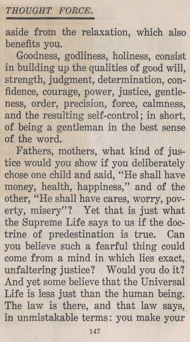 Fathers, mothers, what kind of justice would you show if you deliberately chose one child and said, "He shall have money, health, happiness," and of the other, "He shall have cares, worry, poverty, misery"? Yet that is just what the Supreme Life says to us if the doctrine of predestination is true. Can you believe such a fearful thing could come from a mind in which lies exact, unfaltering justice? Would you do it? And yet some believe that the Universal Life is less just than the human being. The law is there, and that law says, in unmistakable terms: you make your