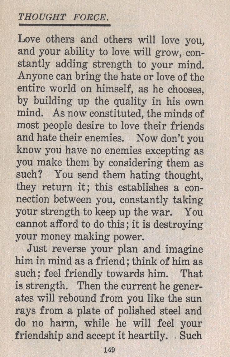 Love others and others will love you, and your ability to love will grow, constantly adding strength to your mind. Anyone can bring the hate or love of the entire world on himself, as he chooses, by building up the quality in his own mind. As now constituted, the minds of most people desire to love their friends and hate their enemies. Now don't you know you have no enemies excepting as you make them by considering them as such? You send them hating thought, they return it; this establishes a connection between you, constantly taking your strength to keep up the war. You cannot afford to do this; it is destroying your money making power.