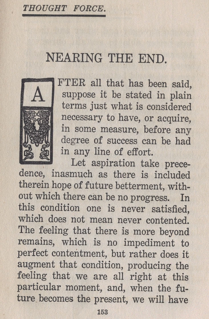 Let aspiration take precedence, inasmuch as there is included therein hope of future betterment, without which there can be no progress. In this condition one is never satisfied, which does not mean never contented. The feeling that there is more beyond remains, which is no impediment to perfect contentment, but rather does it augment that condition, producing the feeling that we are all right at this particular moment, and, when the future becomes the present, we will have