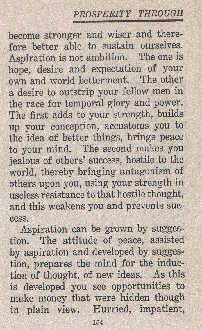 Aspiration can be grown by suggestion. The attitude of peace, assisted by aspiration and developed by suggestion, prepares the mind for the induction of thought, of new ideas. As this is developed you see opportunities to make money that were hidden though in plain view. Hurried, impatient,