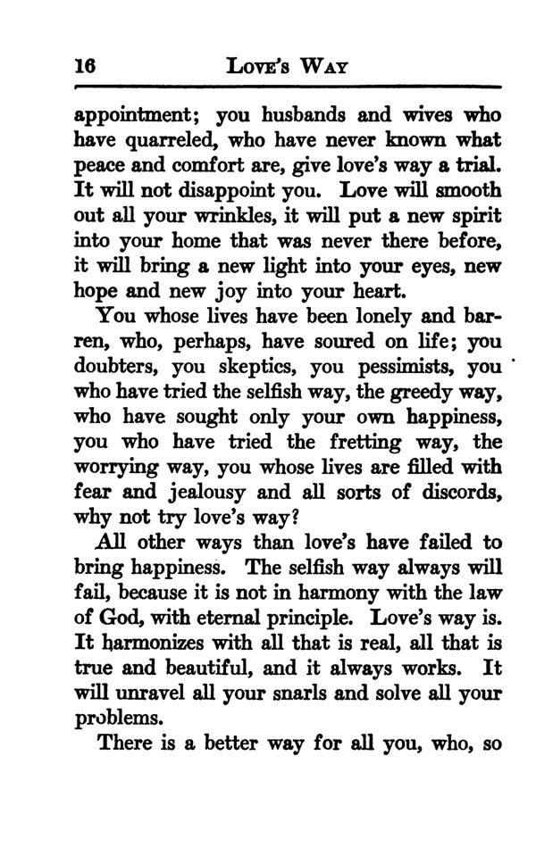 You whose lives have been lonely and barren, who, perhaps, have soured on life; you doubters, you skeptics, you pessimists, you who have tried the selfish way, the greedy way, who have sought only your own happiness, you who have tried the fretting way, the worrying way, you whose lives are filled with fear and jealousy and all sorts of discords, why not try love's way?