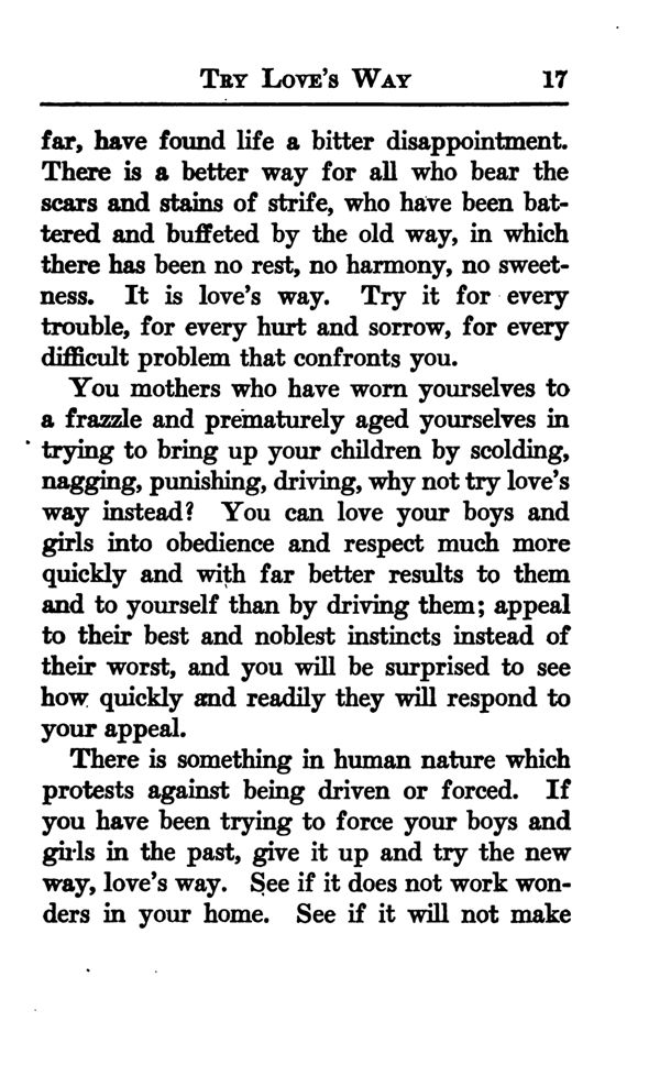 There is something in human nature which protests against being driven or forced. If you have been trying to force your boys and girls in the past, give it up and try the new way, love's way. See if it does not work wonders in your home. See if it will not make