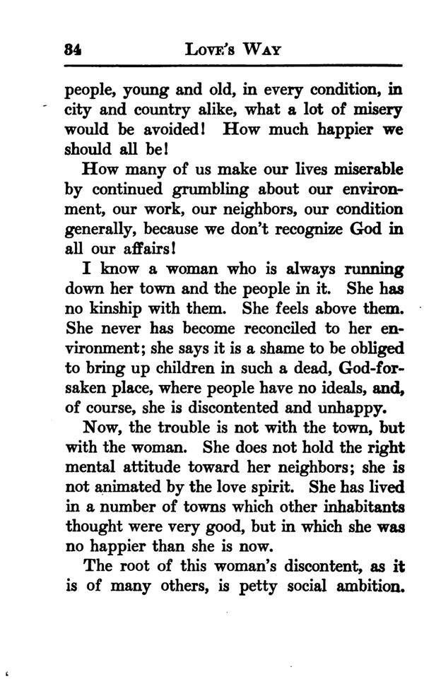 Now, the trouble is not with the town, but with the woman. She does not hold the right mental attitude toward her neighbors; she is not animated by the love spirit. She has lived in a number of towns which other inhabitants thought were very good, but in which she was no happier than she is now.