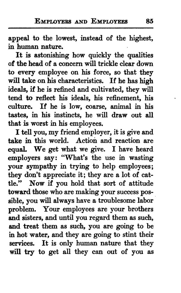 I tell you, my friend employer, it is give and take in this world. Action and reaction are equal. We get what we give. I have heard employers say : "What's the use in wasting your sympathy in trying to help employees; they don't appreciate it; they are a lot of cattle." Now if you hold that sort of attitude toward those who are making your success possible, you will always have a troublesome labor problem. Your employees are your brothers and sisters, and until you regard them as such, and treat them as such, you are going to be in hot water, and they are going to stint their services. It is only human nature that they will try to get all they can out of you as