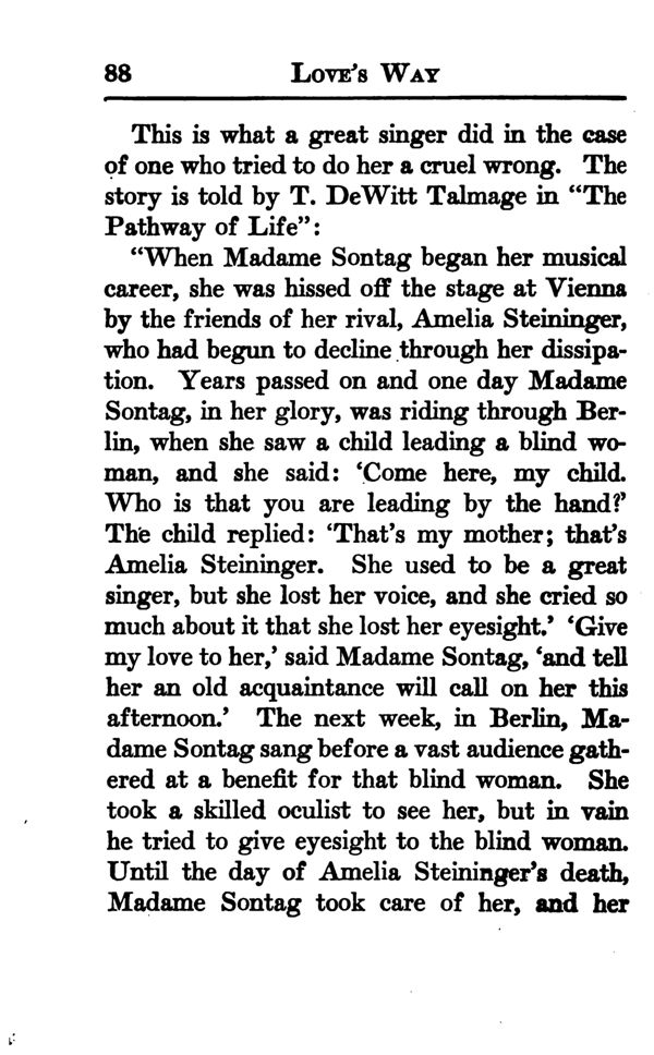 "When Madame Sontag began her musical career, she was hissed off the stage at Vienna by the friends of her rival, Amelia Steininger, who had begun to decline through her dissipation. Years passed on and one day Madame Sontag, in her glory, was riding through Berlin, when she saw a child leading a blind woman, and she said: 'Come here, my child. Who is that you are leading by the hand?' The child replied: 'That's my mother; that's Amelia Steininger. She used to be a great singer, but she lost her voice, and she cried so much about it that she lost her eyesight.' 'Give my love to her,' said Madame Sontag, 'and tell her an old acquaintance will call on her this afternoon.' The next week, in Berlin, Madame Sontag sang before a vast audience gathered at a benefit for that blind woman. She took a skilled oculist to see her, but in vain he tried to give eyesight to the blind woman. Until the day of Amelia Steininger's death, Madame Sontag took care of her, and her