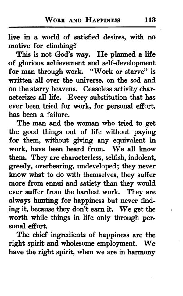 The man and the woman who tried to get the good things out of life without paying for them, without giving any equivalent in work, have been heard from. We all know them. They are characterless, selfish, indolent, greedy, overbearing, undeveloped; they never know what to do with themselves, they suffer more from ennui and satiety than they would ever suffer from the hardest work. They are always hunting for happiness but never finding it, because they don't earn it. We get the worth while things in life only through personal effort.