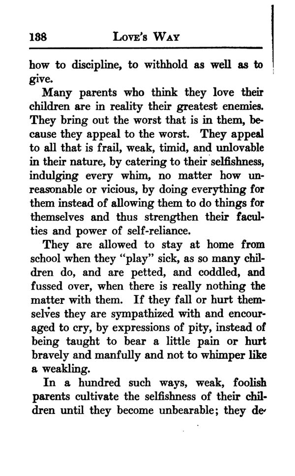 Many parents who think they love their children are in reality their greatest enemies. They bring out the worst that is in them, because they appeal to the worst. They appeal to all that is frail, weak, timid, and unlovable in their nature, by catering to their selfishness, indulging every whim, no matter how unreasonable or vicious, by doing everything for them instead of allowing them to do things for themselves and thus strengthen their faculties and power of self-reliance.