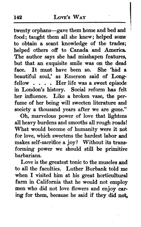 Love is the greatest tonic to the muscles and to all the faculties. Luther Burbank told me when I visited him at his great horticultural farm in California that he would not employ men who did not love flowers and enjoy caring for them, because he said if they did not,
