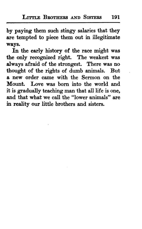 In the early history of the race might was the only recognized right. The weakest was always afraid of the strongest. There was no thought of the rights of dumb animals. But a new order came with the Sermon on the Mount. Love was born into the world and it is gradually teaching man that all life is one, and that what we call the "lower animals" are in reality our little brothers and sisters.