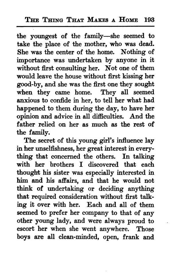 The secret of this young girl's influence lay in her unselfishness, her great interest in everything that concerned the others. In talking with her brothers I discovered that each thought his sister was especially interested in him and his affairs, and that he would not think of undertaking or deciding anything that required consideration without first talking it over with her. Each and all of them seemed to prefer her company to that of any other young lady, and were always proud to escort her when she went anywhere. Those boys are all clean-minded, open, frank and