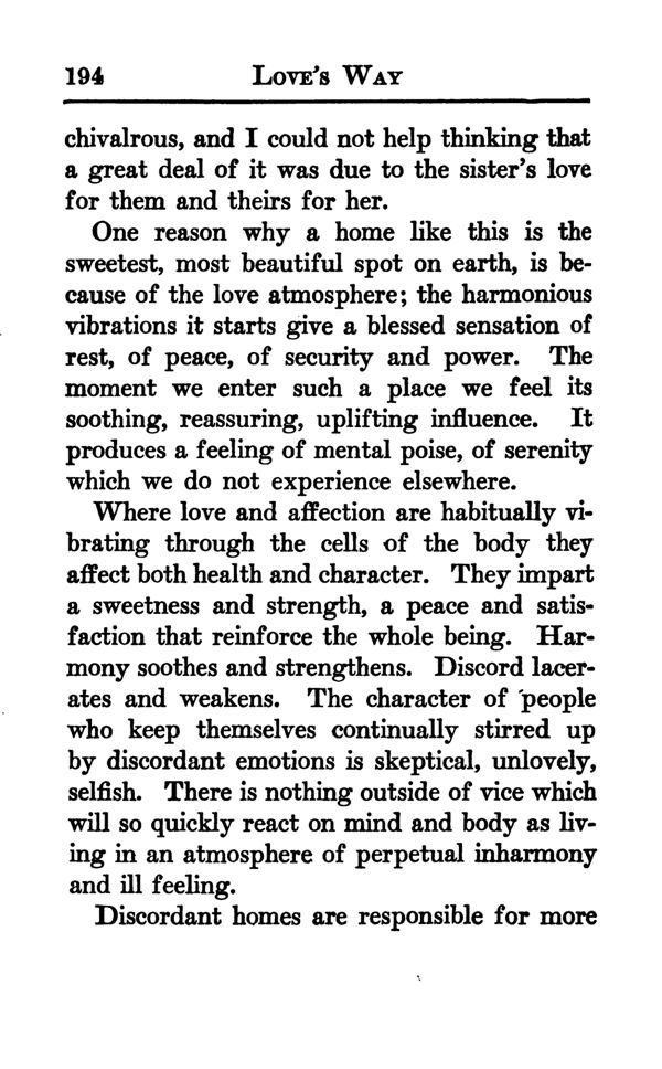Where love and affection are habitually vibrating through the cells of the body they affect both health and character. They impart a sweetness and strength, a peace and satisfaction that reinforce the whole being. Harmony soothes and strengthens. Discord lacerates and weakens. The character of 'people who keep themselves continually stirred up by discordant emotions is skeptical, unlovely, selfish. There is nothing outside of vice which will so quickly react on mind and body as living in an atmosphere of perpetual inharmony and ill feeling.