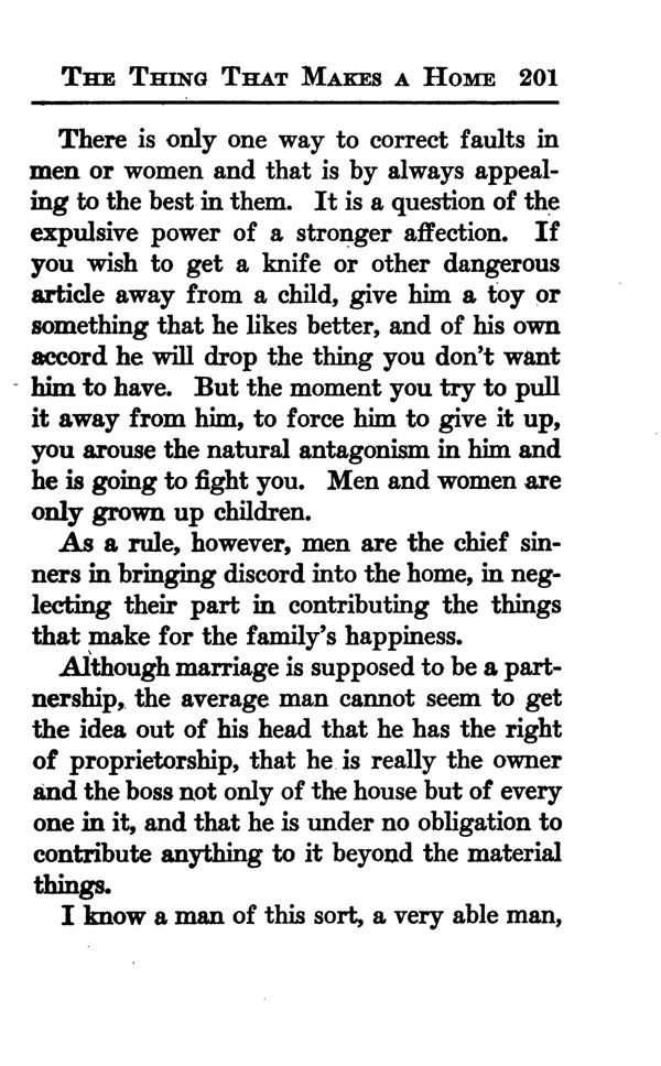 Although marriage is supposed to be a partnership, the average man cannot seem to get the idea out of his head that he has the right of proprietorship, that he is really the owner and the boss not only of the house but of every one in it, and that he is under no obligation to contribute anything to it beyond the material things.
