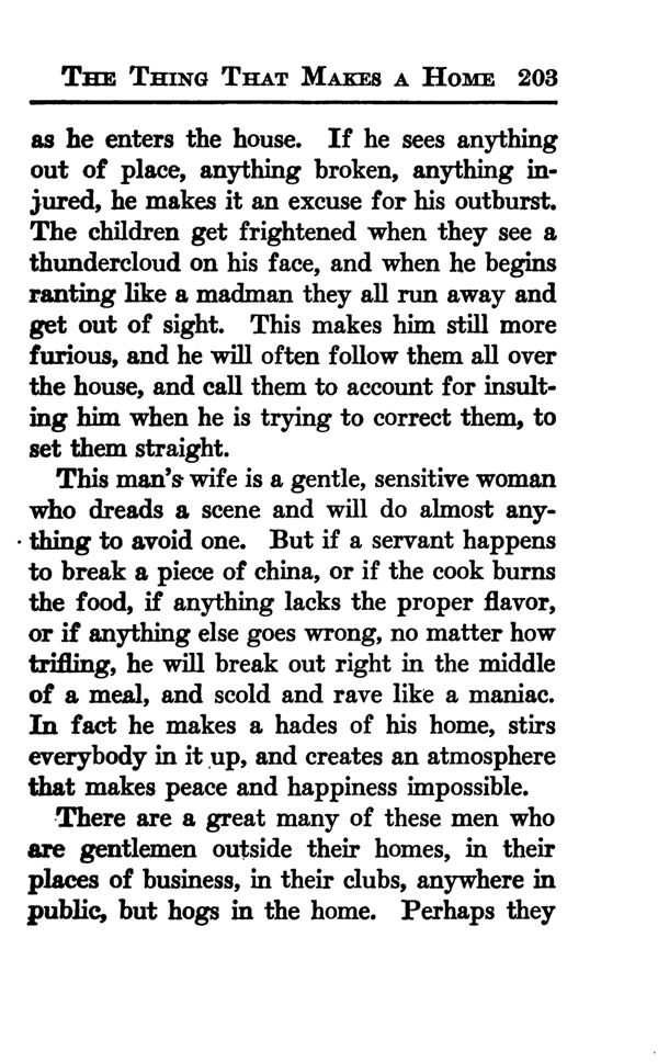 This man's wife is a gentle, sensitive woman who dreads a scene and will do almost anything to avoid one. But if a servant happens to break a piece of china, or if the cook burns the food, if anything lacks the proper flavor, or if anything else goes wrong, no matter how trifling, he will break out right in the middle of a meal, and scold and rave like a maniac. In fact he makes a hades of his home, stirs everybody in it up, and creates an atmosphere that makes peace and happiness impossible.