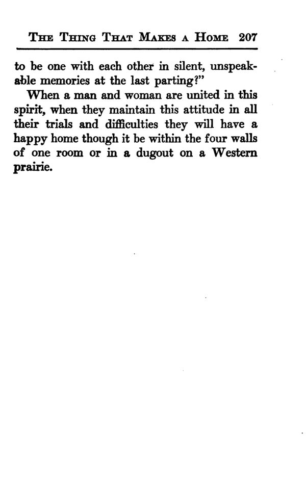 When a man and woman are united in this spirit, when they maintain this attitude in all their trials and difficulties they will have a happy home though it be within the four walls of one room or in a dugout on a Western prairie.