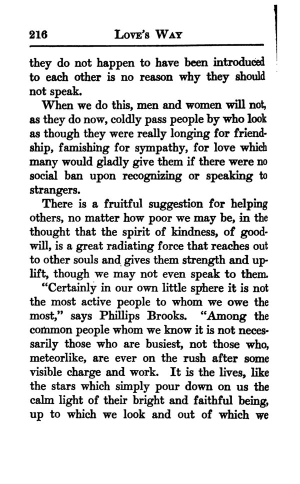 When we do this, men and women will not, as they do now, coldly pass people by who look as though they were really longing for friendship, famishing for sympathy, for love which many would gladly give them if there were no social ban upon recognizing or speaking to strangers.