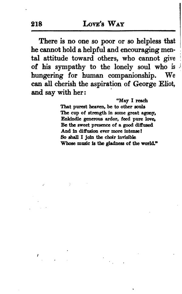 There is no one so poor or so helpless that he cannot hold a helpful and encouraging mental attitude toward others, who cannot give of his sympathy to the lonely soul who is hungering for human companionship. We can all cherish the aspiration of George Eliot, and say with her: