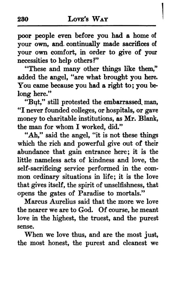 "Ah," said the angel, "it is not these things which the rich and powerful give out of their abundance that gain entrance here; it is the little nameless acts of kindness and love, the self-sacrificing service performed in the common ordinary situations in life; it is the love that gives itself, the spirit of unselfishness, that opens the gates of Paradise to mortals."