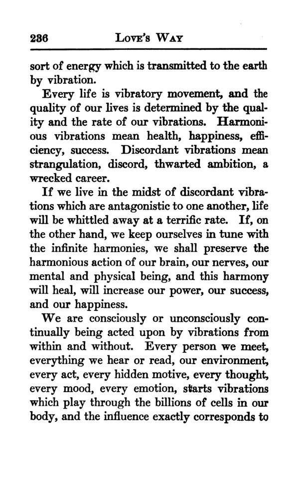 Every life is vibratory movement, and the quality of our lives is determined by the quality and the rate of our vibrations. Harmonious vibrations mean health, happiness, efficiency, success. Discordant vibrations mean strangulation, discord, thwarted ambition, a wrecked career.