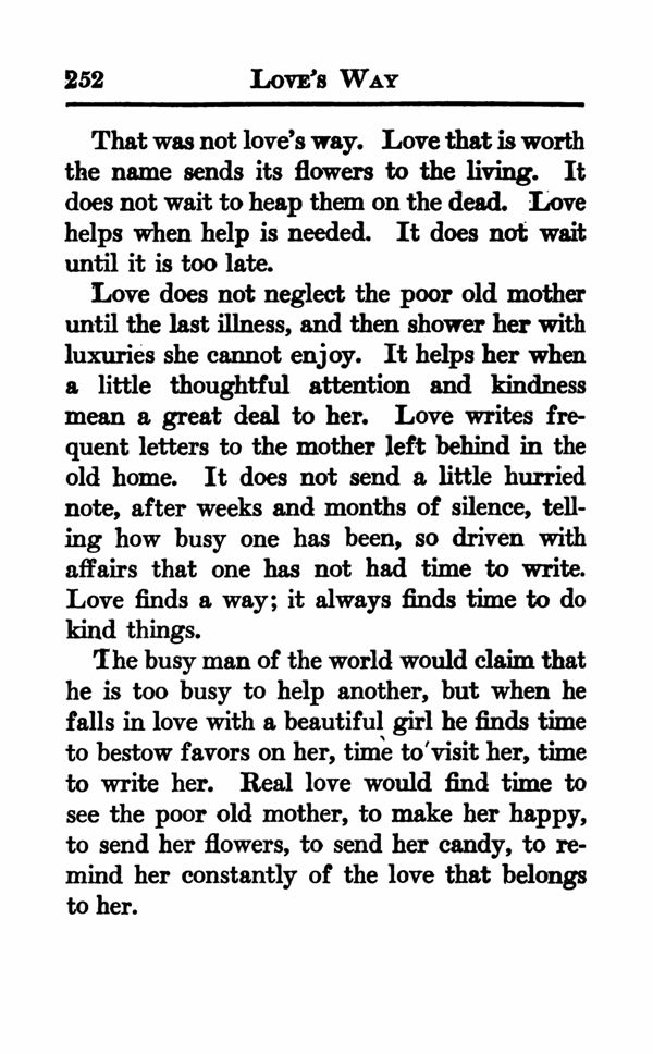 Love does not neglect the poor old mother until the last illness, and then shower her with luxuries she cannot enjoy. It helps her when a little thoughtful attention and kindness mean a great deal to her. Love writes frequent letters to the mother left behind in the old home. It does not send a little hurried note, after weeks and months of silence, telling how busy one has been, so driven with affairs that one has not had time to write. Love finds a way; it always finds time to do kind things.
