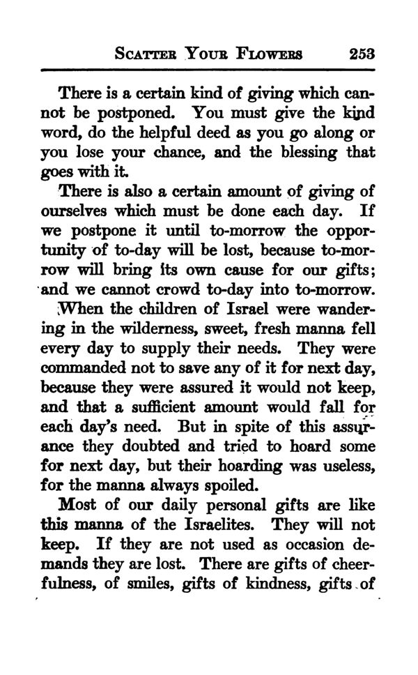 There is a certain kind of giving which cannot be postponed. You must give the kind word, do the helpful deed as you go along or you lose your chance, and the blessing that goes with it.