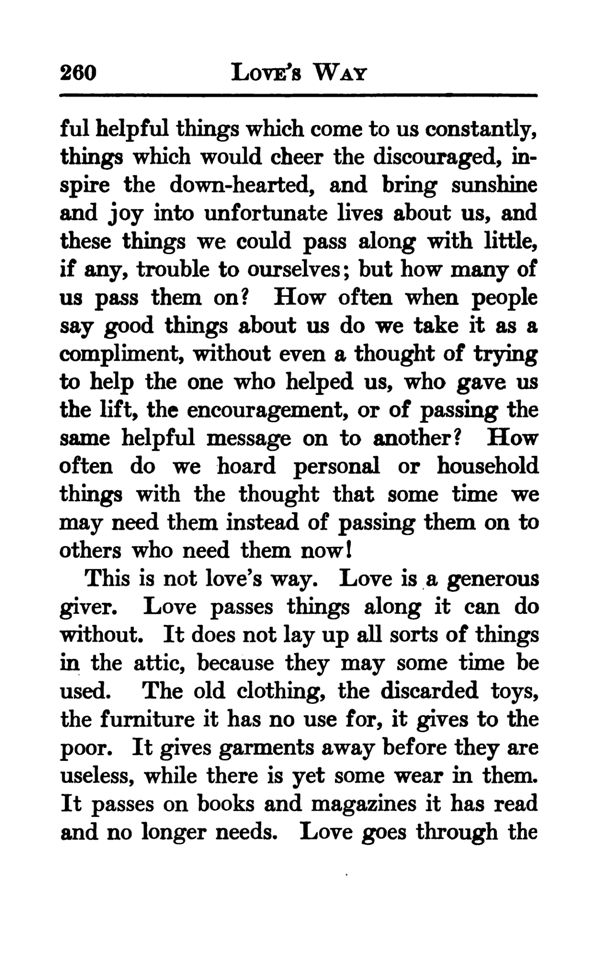 This is not love's way. Love is a generous giver. Love passes things along it can do without. It does not lay up all sorts of things in the attic, because they may some time be used. The old clothing, the discarded toys, the furniture it has no use for, it gives to the