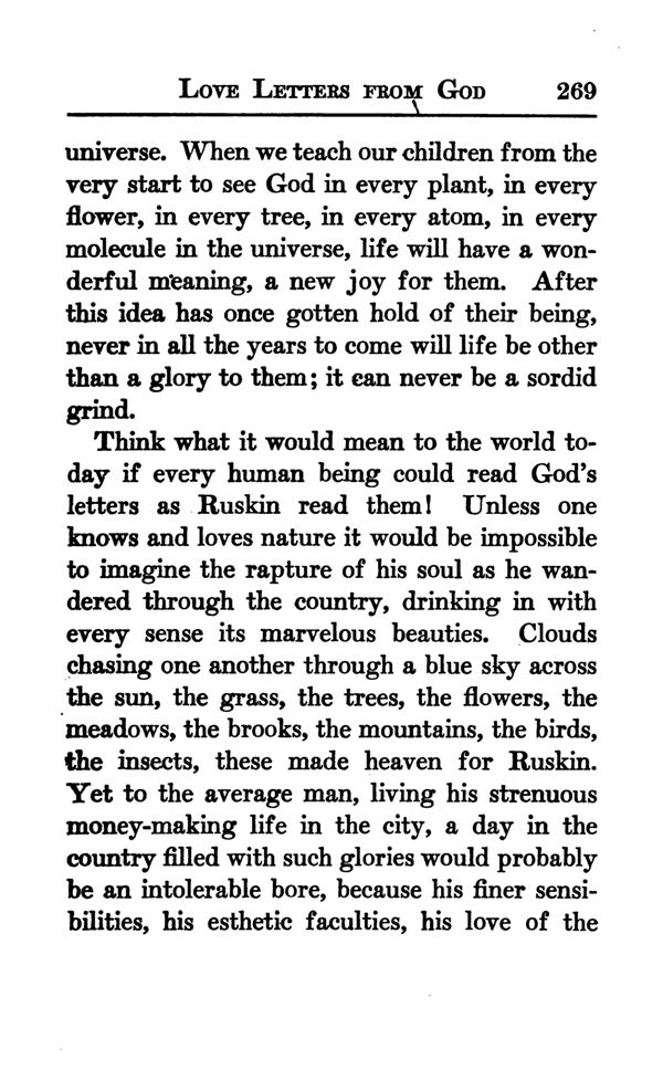 Think what it would mean to the world to day if every human being could read God's letters as Ruskin read them! Unless one knows and loves nature it would be impossible to imagine the rapture of his soul as he wandered through the country, drinking in with every sense its marvelous beauties. Clouds chasing one another through a blue sky across the sun, the grass, the trees, the flowers, the meadows, the brooks, the mountains, the birds, the insects, these made heaven for Ruskin. Yet to the average man, living his strenuous money-making life in the city, a day in the country filled with such glories would probably be an intolerable bore, because his finer sensibilities, his esthetic faculties, his love of the
