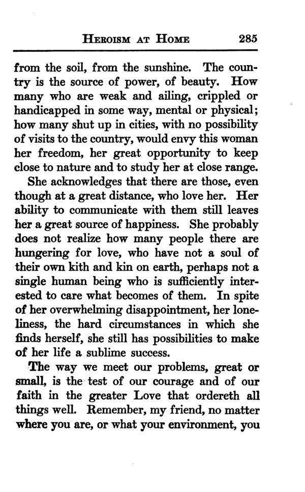 She acknowledges that there are those, even though at a great distance, who love her. Her ability to communicate with them still leaves her a great source of happiness. She probably does not realize how many people there are hungering for love, who have not a soul of their own kith and kin on earth, perhaps not a single human being who is sufficiently interested to care what becomes of them. In spite of her overwhelming disappointment, her loneliness, the hard circumstances in which she finds herself, she still has possibilities to make of her life a sublime success.