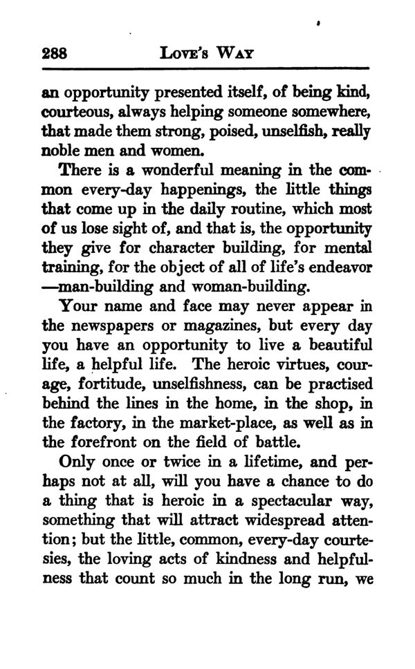 There is a wonderful meaning in the common every-day happenings, the little things that come up in the daily routine, which most of us lose sight of, and that is, the opportunity they give for character building, for mental training, for the object of all of life's endeavor man-building and woman-building.