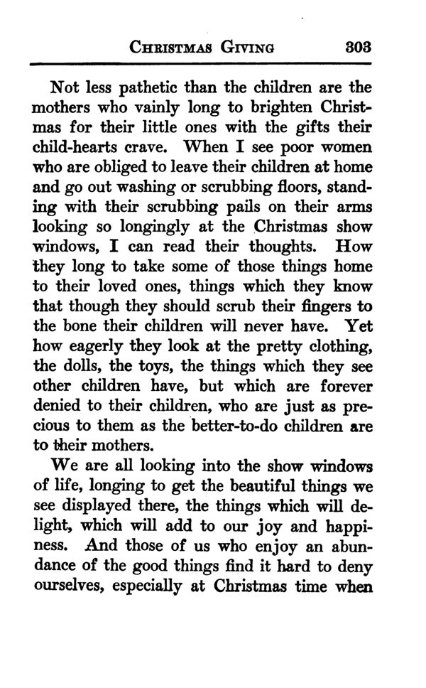 Not less pathetic than the children are the mothers who vainly long to brighten Christmas for their little ones with the gifts their child-hearts crave. When I see poor women who are obliged to leave their children at home and go out washing or scrubbing floors, standing with their scrubbing pails on their arms looking so longingly at the Christmas show windows, I can read their thoughts. How they long to take some of those things home to their loved ones, things which they know that though they should scrub their fingers to the bone their children will never have. Yet how eagerly they look at the pretty clothing, the dolls, the toys, the things which they see other children have, but which are forever denied to their children, who are just as precious to them as the better-to-do children are to their mothers.