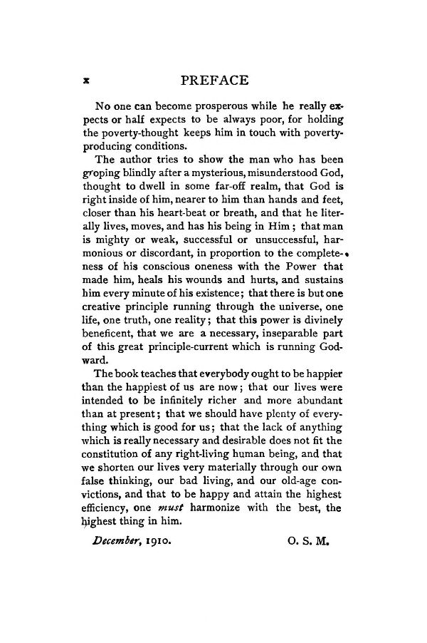 The book teaches that everybody ought to be happier than the happiest of us are now; that our lives were intended to be infinitely richer and more abundant than at present; that we should have plenty of everything which is good for us; that the lack of anything which is really necessary and desirable does not fit the constitution of any right-living human being, and that we shorten our lives very materially through our own false thinking, our bad living, and our old-age convictions, and that to be happy and attain the highest efficiency, one must harmonize with the best, the highest thing in him.