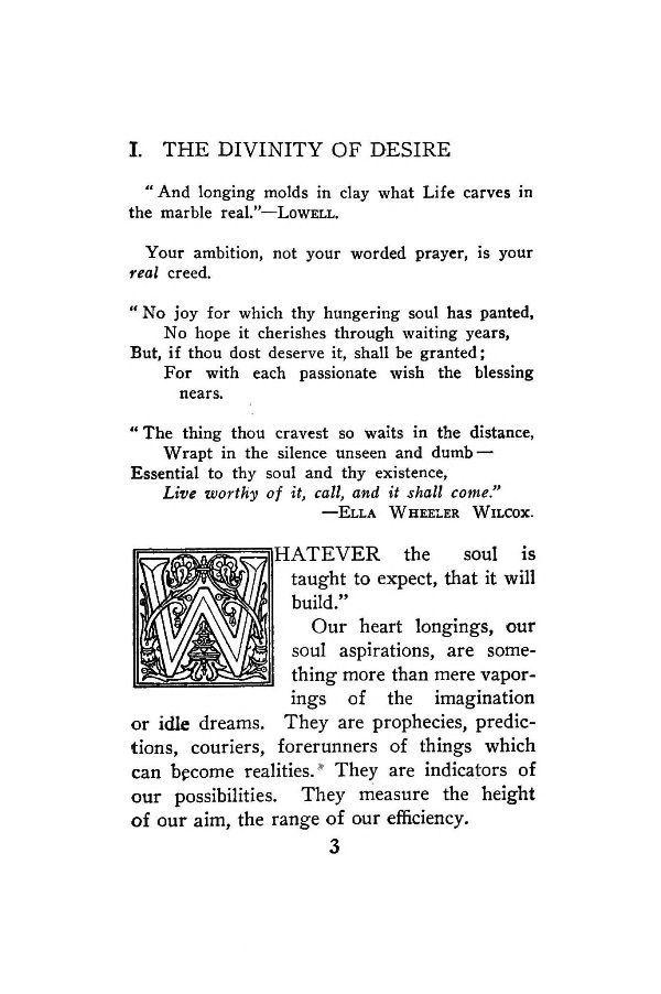 The Divinity of Desire - Success and Happiness Are for You - Working for One Thing and Expecting Something Else - Expect Great Things of Yourself - Self-Encouragement by Self-Suggestion - The Crime of the "Blues" - Change the Thought, Change the Man - The Paralysis of Fear - One With the Divine - Getting in Tune - The Great Within - A New Way of Bringing Up Children - Training for Longevity - As a Man Thinketh - Mental Self-Thought Poisoning - Contents -
