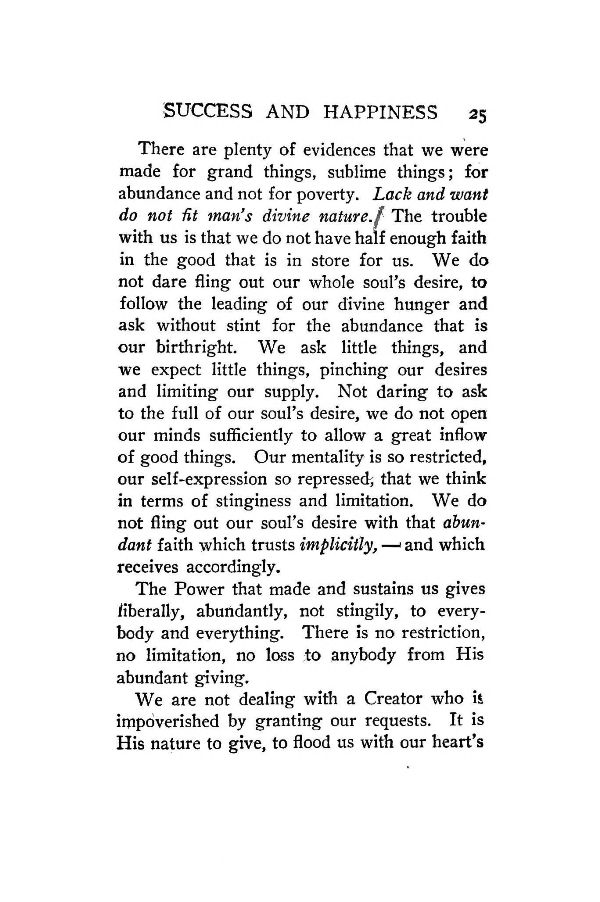 There are plenty of evidences that we were made for grand things, sublime things; for abundance and not for poverty. Lack and want do not it man's divine nature. The trouble with us is that we do not have half enough faith in the good that is in store for us. We do not dare fling out our whole soul's desire, to follow the leading of our divine hunger and ask without stint for the abundance that is our birthright. We ask little things, and we expect little things, pinching our desires and limiting our supply. Not daring to ask to the full of our soul's desire, we do not open our minds sufficiently to allow a great inflow of good things. Our mentality is so restricted, our self-expression so repressed, that we think in terms of stinginess and limitation. We do not fling out our soul's desire with that abundant faith which trusts implicitly, --- and which receives accordingly.