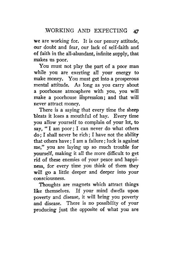 There is a saying that every time the sheep bleats it loses a mouthful of hay. Every time you allow yourself to complain of your lot, to say, "I am poor; I can never do what others do; I shall never be rich; I have not the ability that others have; I am a failure; luck is against me," you are laying up so much trouble for yourself, making it all the more difficult to get rid of these enemies of your peace and happiness, for every time you think of them they will go a little deeper and deeper into your consciousness.